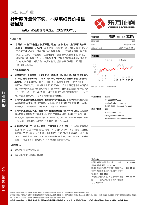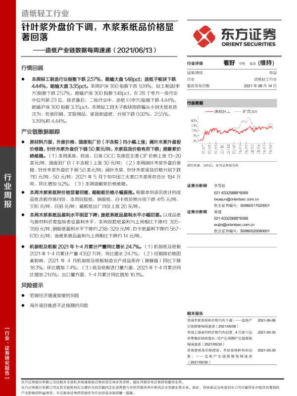 【东方证券】【20210614】20210614-东方证券-造纸产业链数据每周速递:针叶浆外盘价下调,木浆系纸品价格显著回落-13页