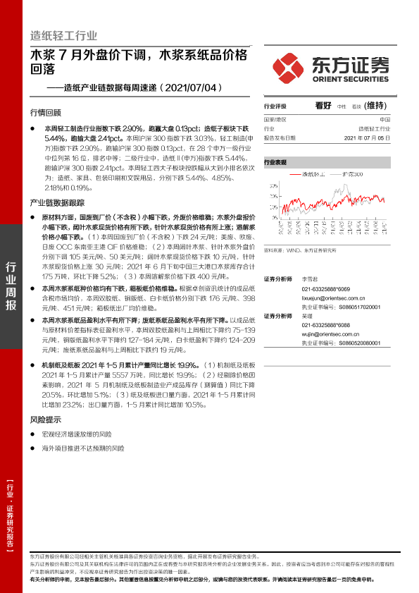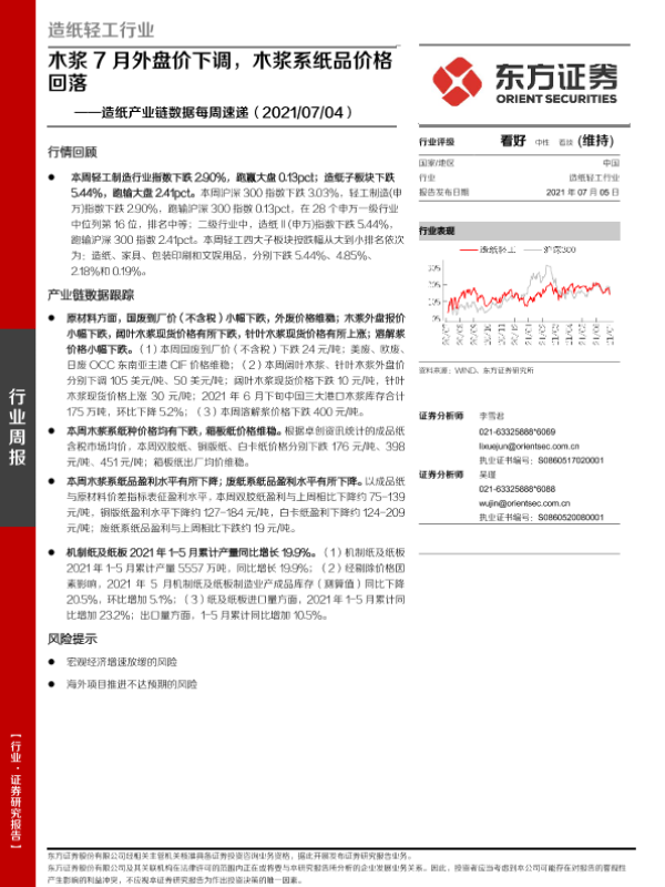【东方证券】【20210705】20210705-东方证券-造纸产业链数据每周速递:木浆7月外盘价下调,木浆系纸品价格回落-13页