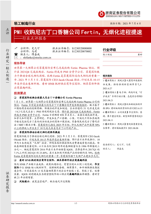 【浙商证券】【20210704】PMI收购尼古丁口香糖公司Fertin,无烟化进程提速-3页