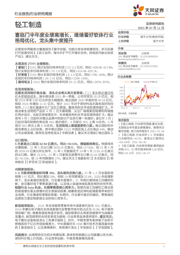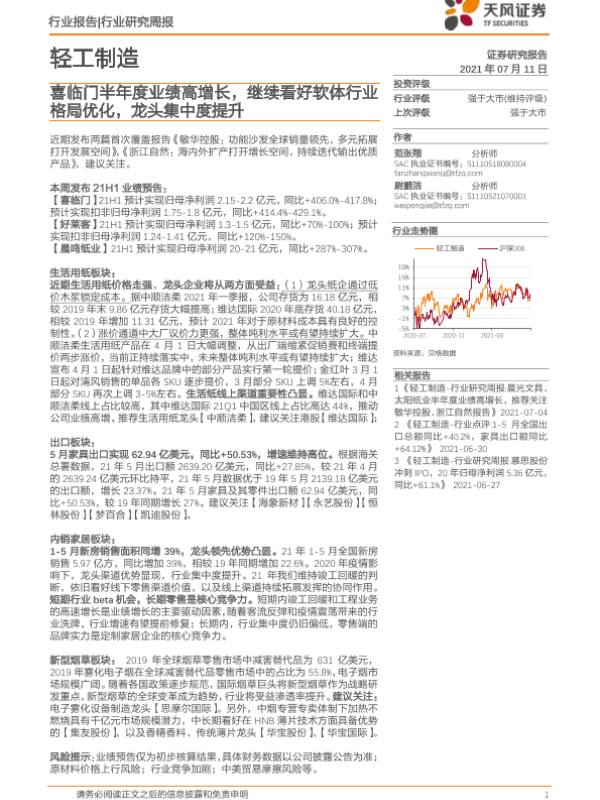 【天风证券】【20210711】轻工制造行业研究周报:喜临门半年度业绩高增长,继续看好软体行业格局优化,龙头集中度提升-18页