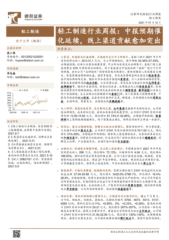 【德邦证券】【20210712】轻工制造行业周报:中报预期催化延续,线上渠道贡献愈加突出-16页