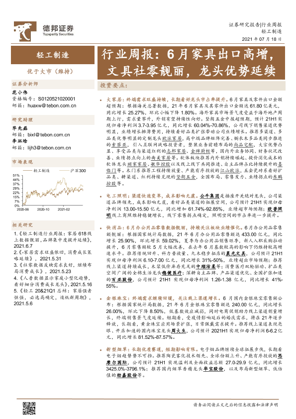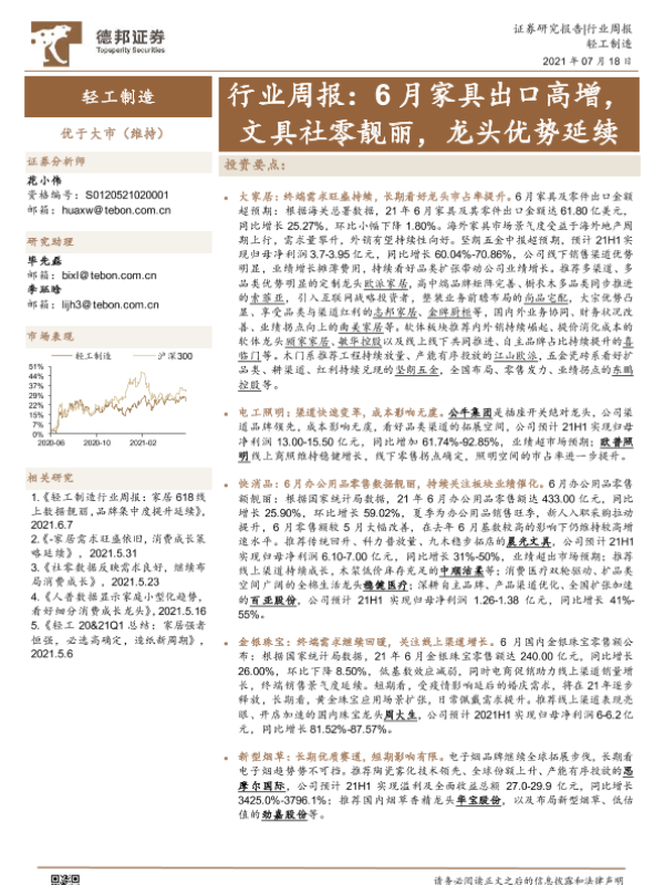 【德邦证券】【20210718】轻工制造行业周报:6月家具出口高增,文具社零靓丽,龙头优势延续-17页
