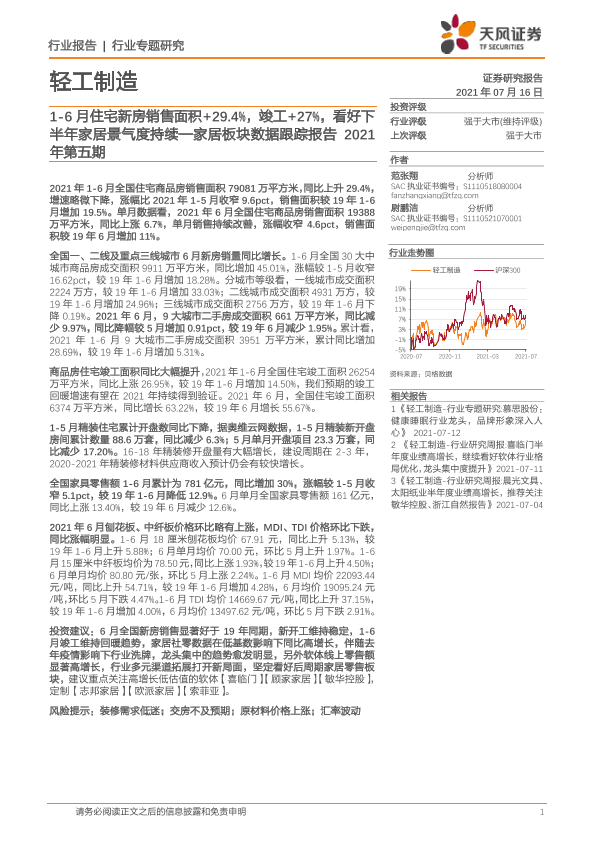 【天风证券】【20210716】家居板块数据跟踪报告2021年第五期:1-6月住宅新房销售面积+29.4%,竣工+27%,看好下半年家居景气度持续-17页