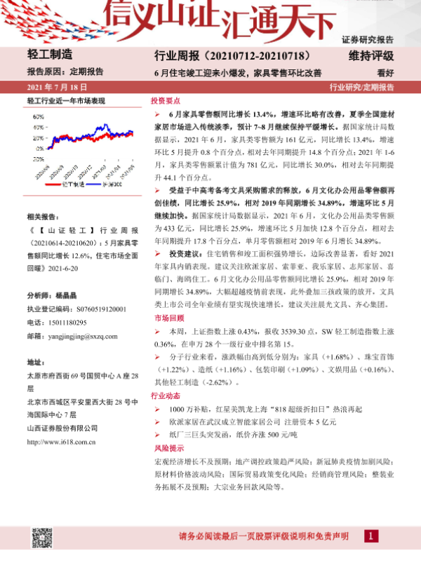 【山西证券】【20210718】20210718-山西证券-轻工制造行业周报:6月住宅竣工迎来小爆发,家具零售环比改善-14页