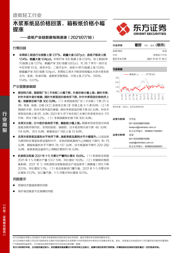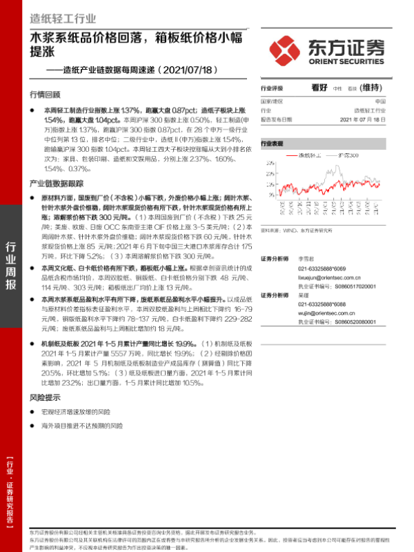 【东方证券】【20210718】20210718-东方证券-造纸产业链数据每周速递:木浆系纸品价格回落,箱板纸价格小幅提涨-13页