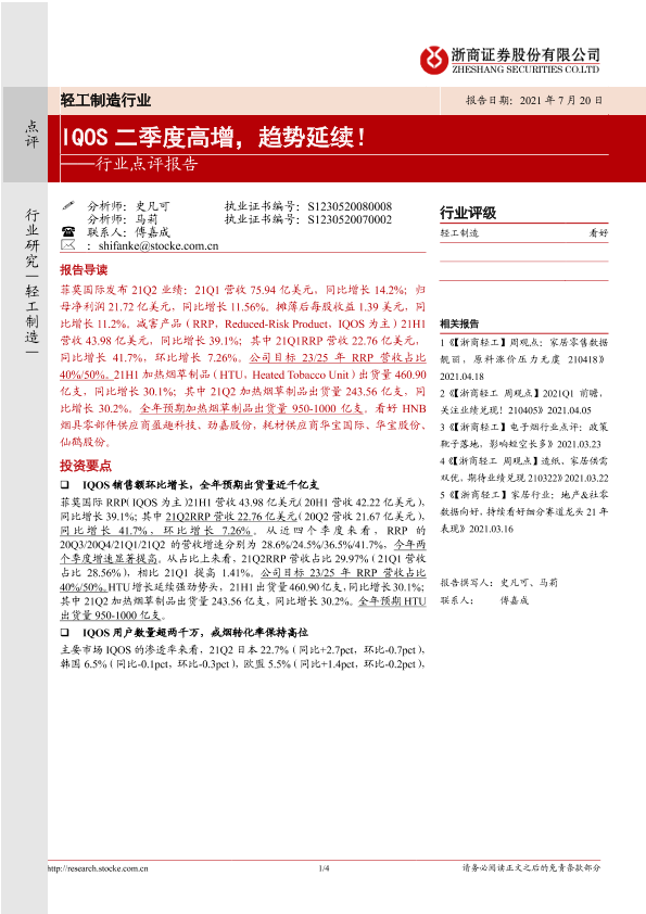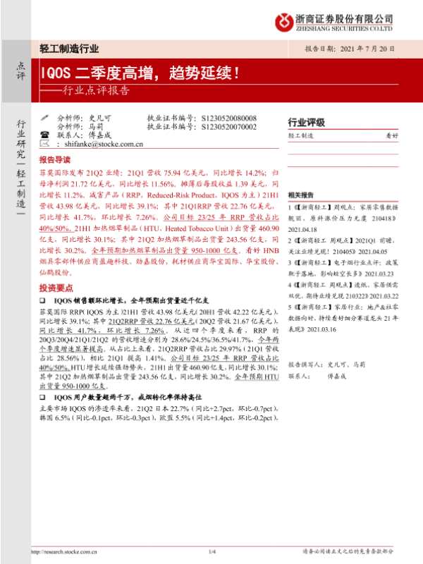 【浙商证券】【20210720】轻工制造行业点评报告:IQOS二季度高增,趋势延续!-4页