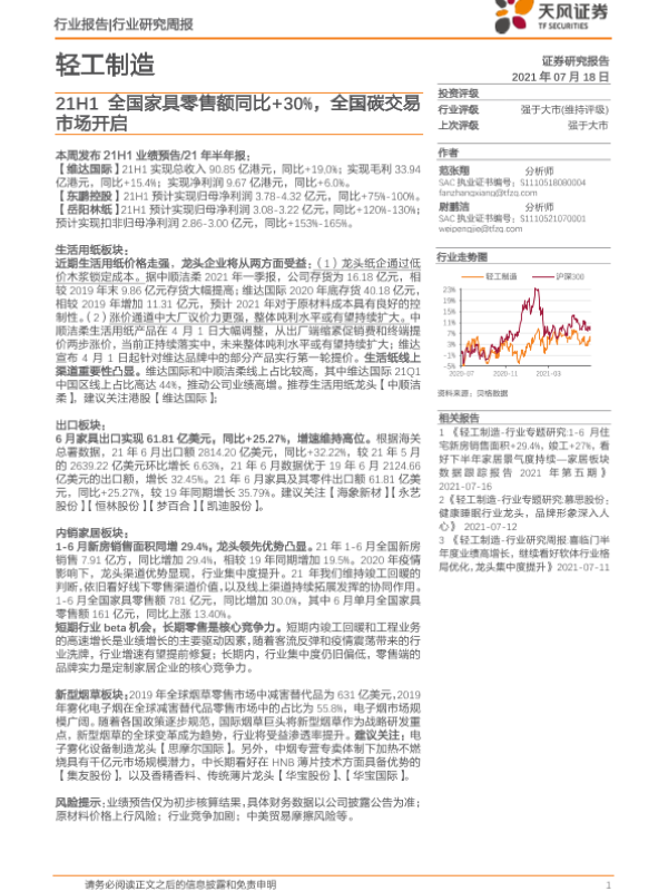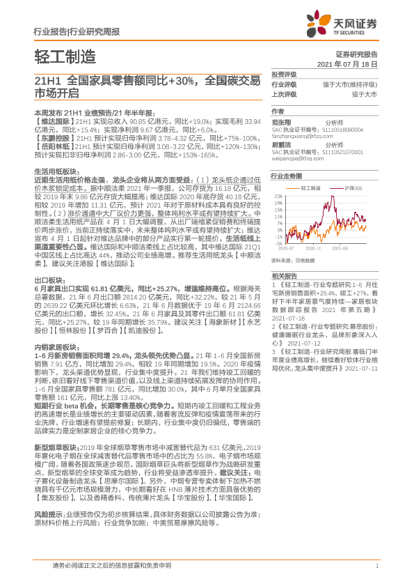 【天风证券】【20210718】20210718-天风证券-轻工制造行业研究周报:21H1全国家具零售额同比+30%,全国碳交易市场开启-21页