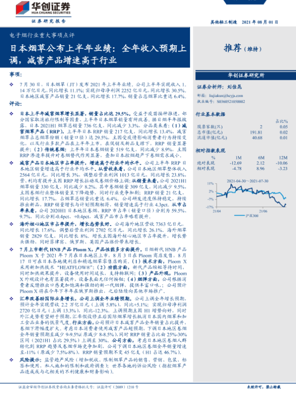 【华创证券】【20210801】电子烟行业重大事项点评:日本烟草公布上半年业绩:全年收入预期上调,减害产品增速高于行业-3页
