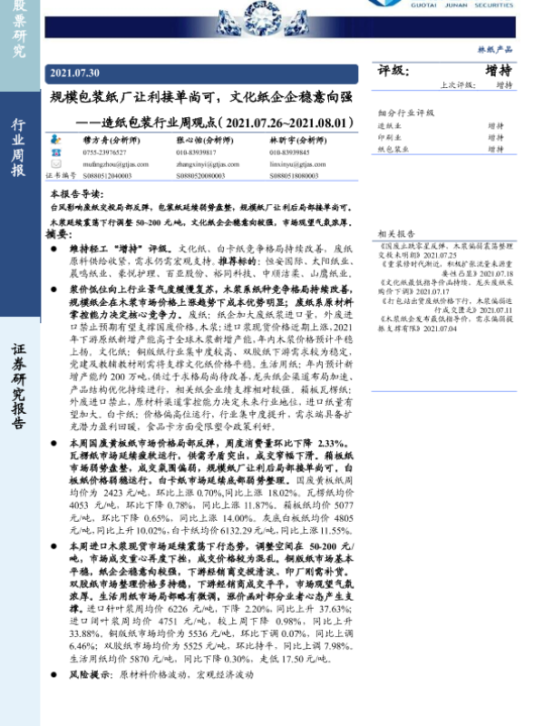 【国泰君安证券】【20210730】20210730-国泰君安-造纸包装行业周观点:规模包装纸厂让利接单尚可,文化纸企企稳意向强-4页