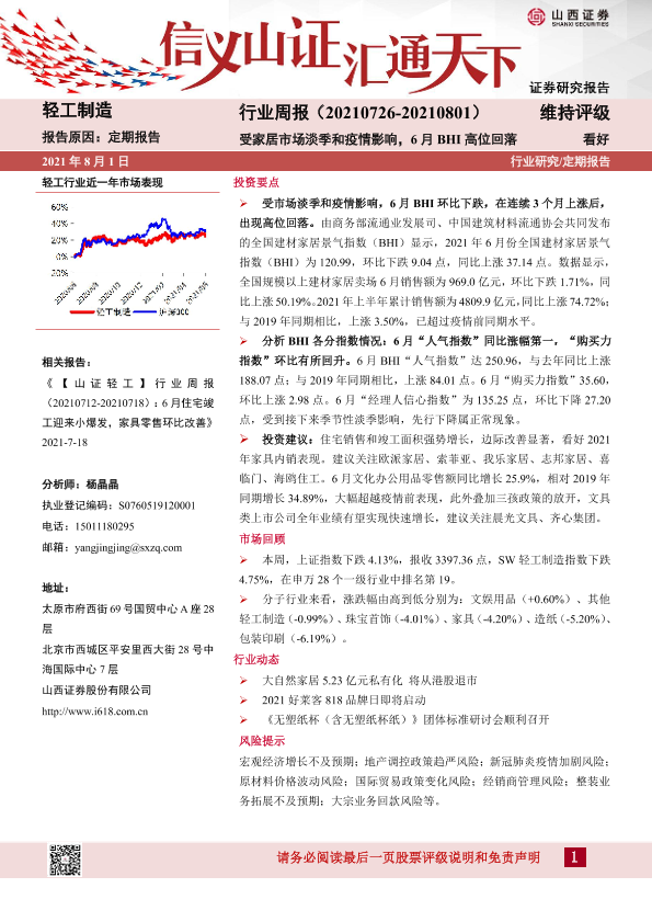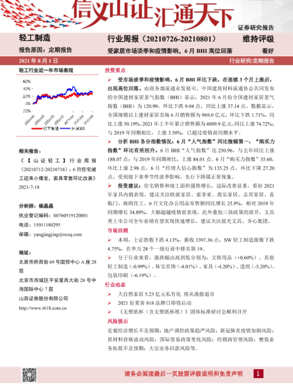 【山西证券】【20210801】轻工制造行业周报:受家居市场淡季和疫情影响,6月BHI高位回落-14页