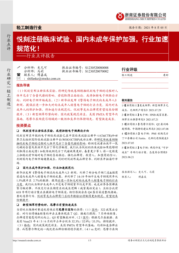 【浙商证券】【20210805】轻工制造行业点评报告:悦刻注册临床试验、国内未成年保护加强,行业加速规范化!-3页