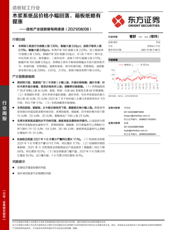 【东方证券】【20210808】20210808-东方证券-造纸产业链数据每周速递:木浆系纸品价格小幅回落,箱板纸略有提涨-14页