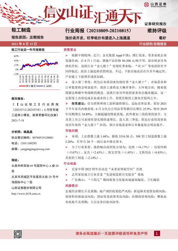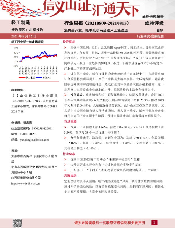 【山西证券】【20210815】20210815-山西证券-轻工制造行业周报:涨价函齐发,旺季纸价有望进入上涨通道-14页
