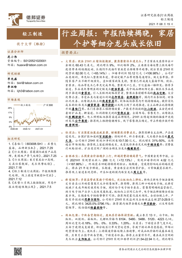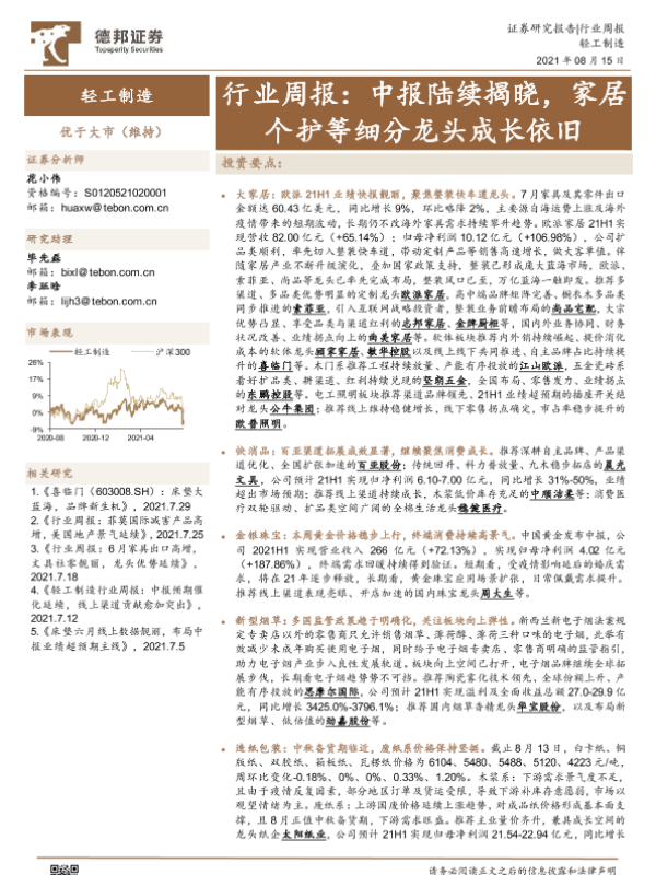 【德邦证券】【20210815】轻工制造行业周报:中报陆续揭晓,家居个护等细分龙头成长依旧-17页