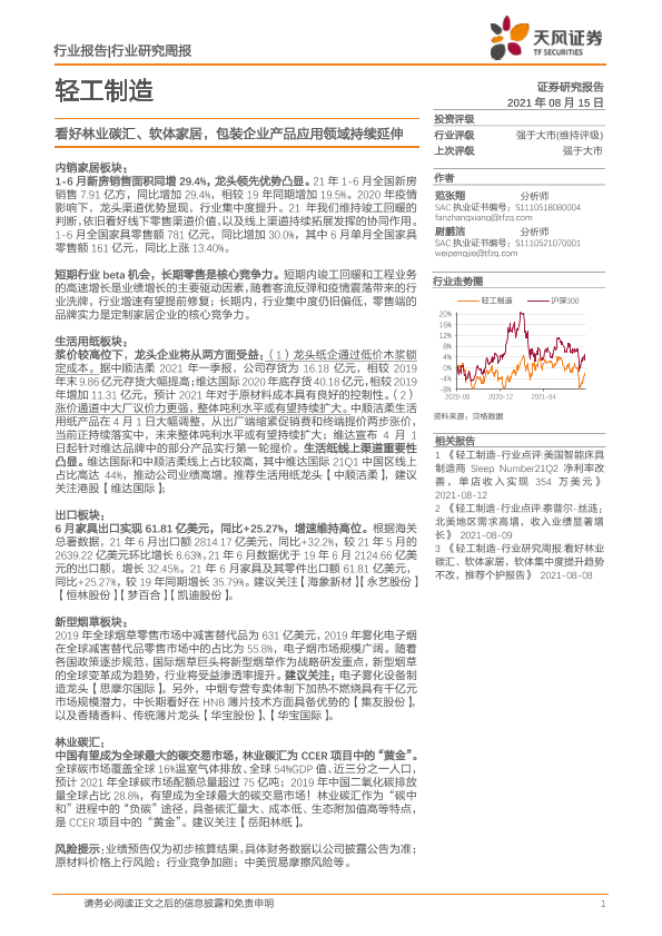 【天风证券】【20210815】20210815-天风证券-轻工制造行业研究周报:看好林业碳汇、软体家居,包装企业产品应用领域持续延伸-22页
