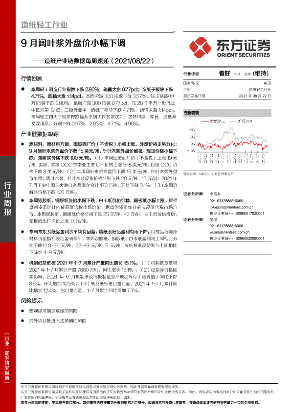 【东方证券】【20210822】20210822-东方证券-造纸产业链数据每周速递:9月阔叶浆外盘价小幅下调-14页