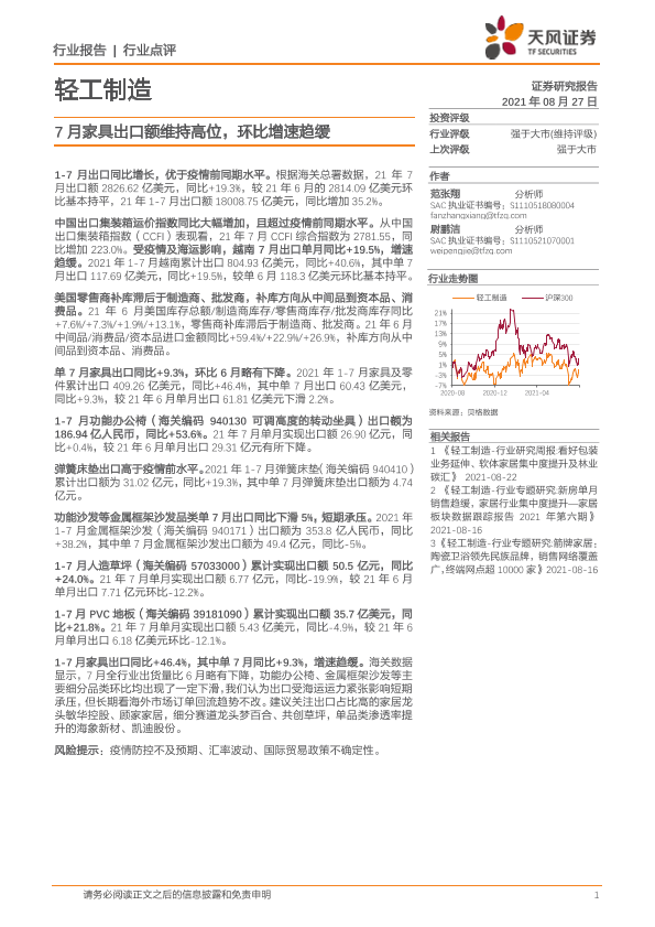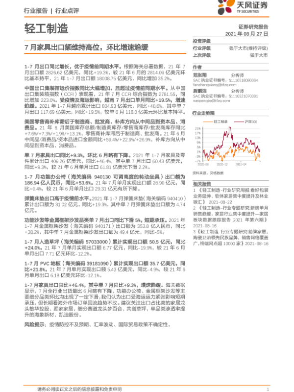 【天风证券】【20210827】轻工制造行业点评:7月家具出口额维持高位,环比增速趋缓-7页