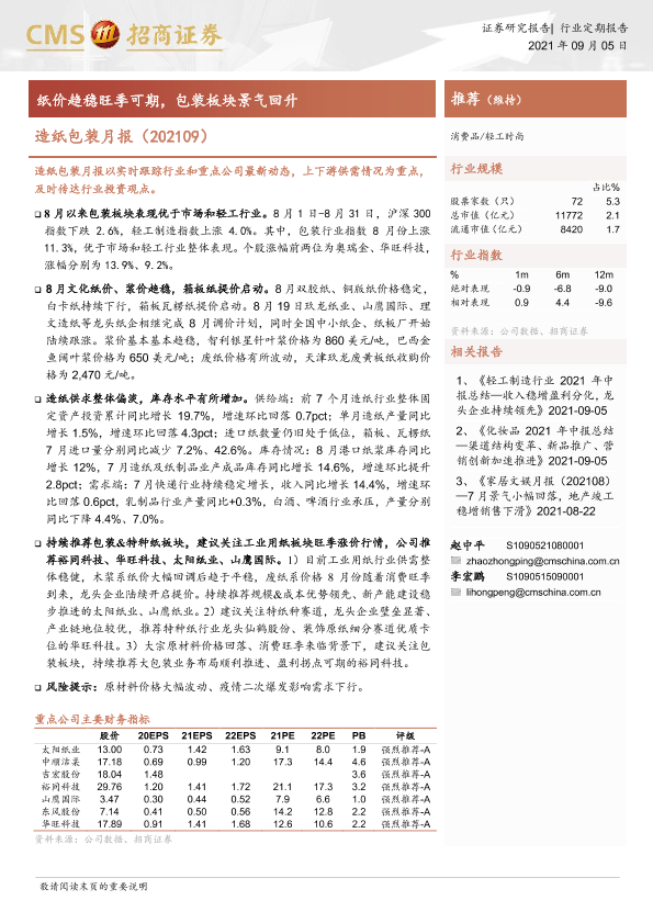 【海通证券】【202109】造纸包装月报:纸价趋稳旺季可期,包装板块景气回升-14页