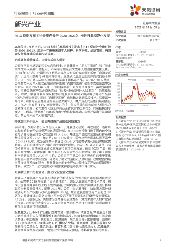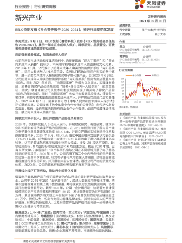 【天风证券】【20210905】20210905-天风证券-新兴产业行业研究周报:RELX悦刻发布《社会责任报告2020-2021》,推进行业规范化发展-5页