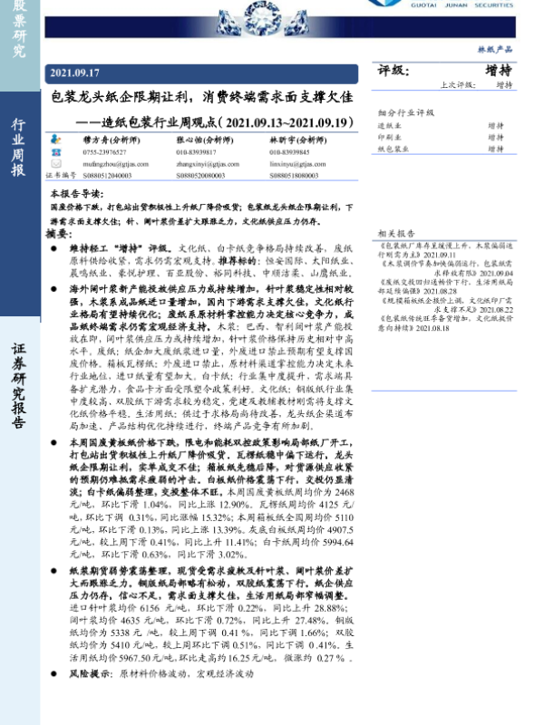 【国泰君安证券】【20210917】包装龙头纸企限期让利,消费终端需求面支撑欠佳-4页