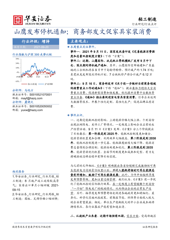 【华安证券】【20210920】轻工制造:山鹰发布停机通知;商务部发文促家具家装消费-3页