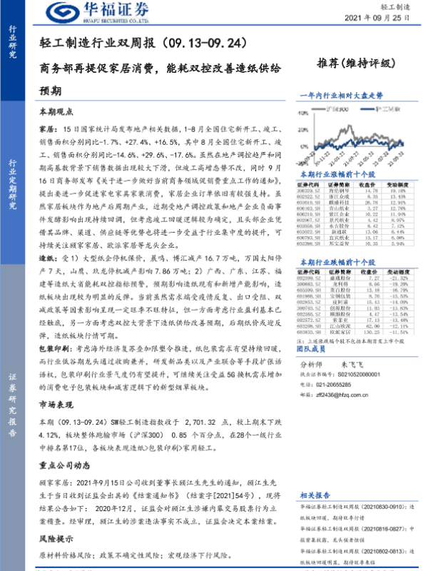 【华福证券】【20210925】轻工制造行业双周报:商务部再提促家居消费,能耗双控改善造纸供给预期-10页