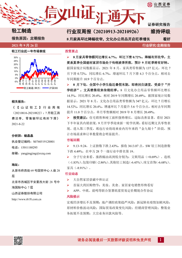 【山西证券】【20210926】20210926-山西证券-轻工制造行业双周报:8月家具环比降幅收窄,文化办公用品开启旺季增长-13页
