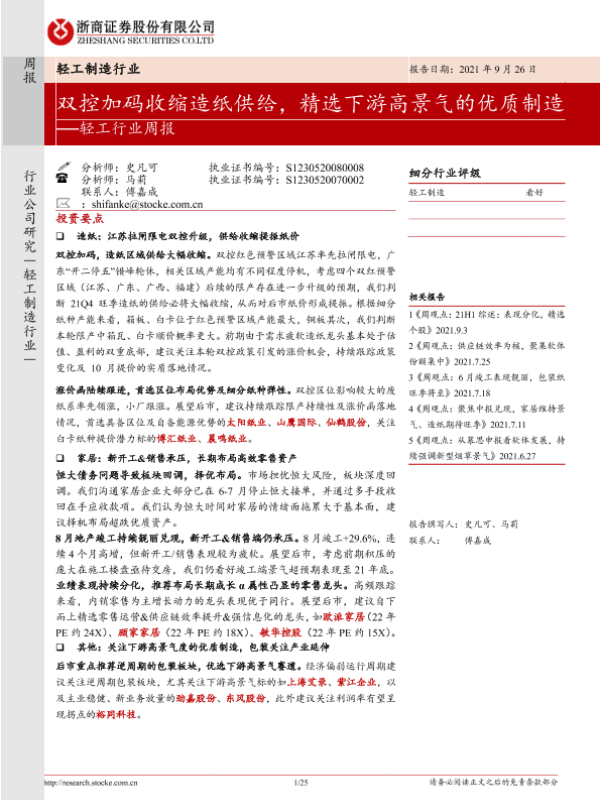 【浙商证券】【20210926】20210926-浙商证券-轻工行业周报:双控加码收缩造纸供给,精选下游高景气的优质制造-25页