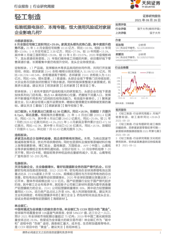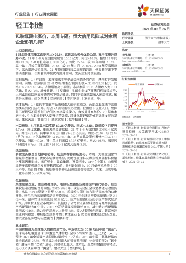 【天风证券】【20210926】20210926-天风证券-轻工制造行业研究周报:包装纸限电涨价,本周专题:恒大信用风险或对家居企业影响几何?-24页