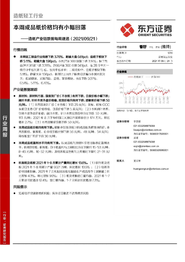 【东方证券】【20210921】20210921-东方证券-造纸产业链数据每周速递:本周成品纸价格均有小幅回落-14页