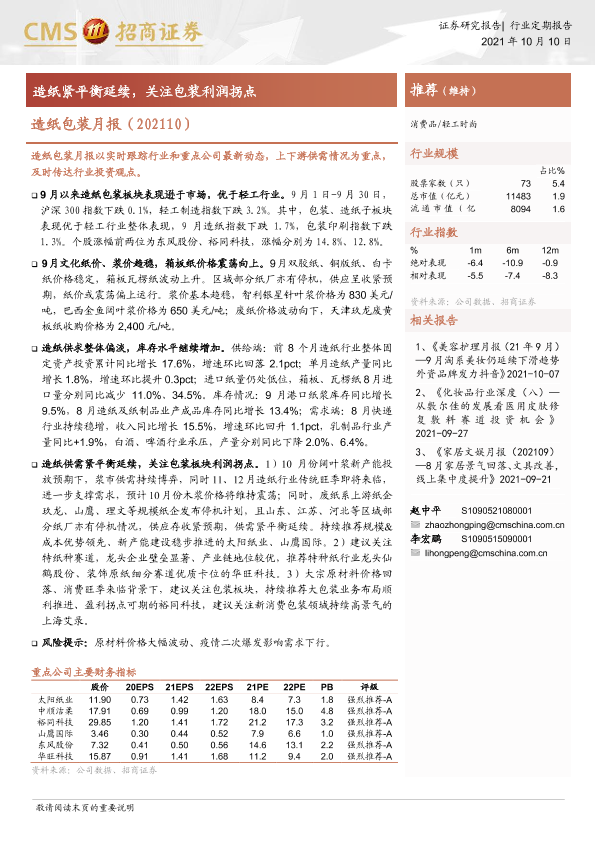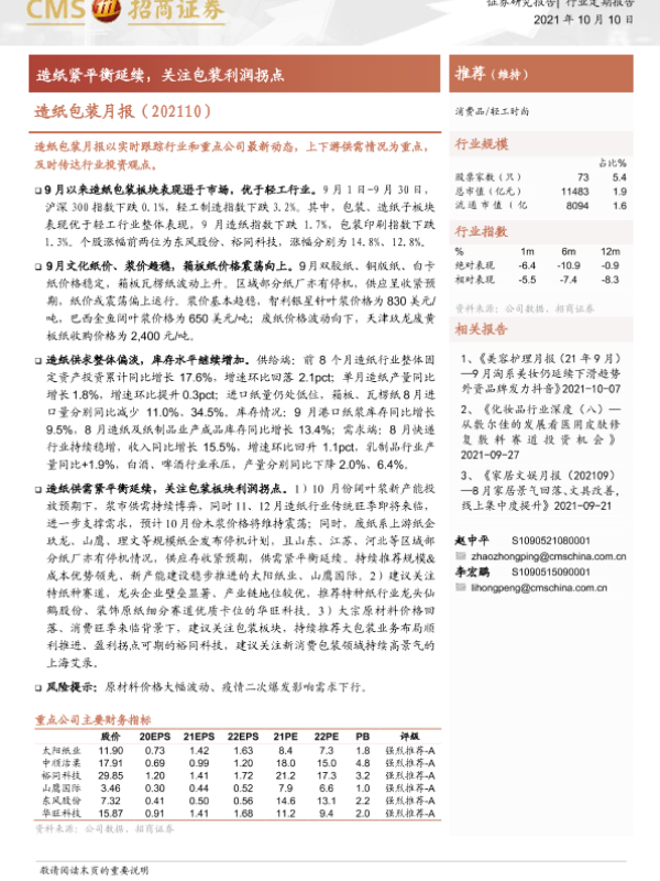 【海通证券】【20211010】造纸包装行业月报:造纸紧平衡延续,关注包装利润拐点-14页