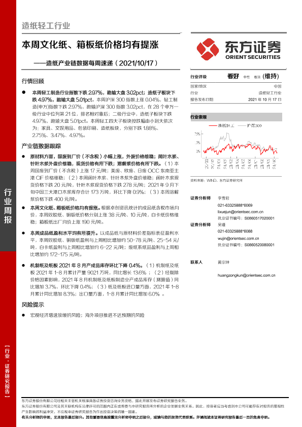 【东方证券】【20211017】20211017-东方证券-造纸产业链数据每周速递:本周文化纸、箱板纸价格均有提涨-13页