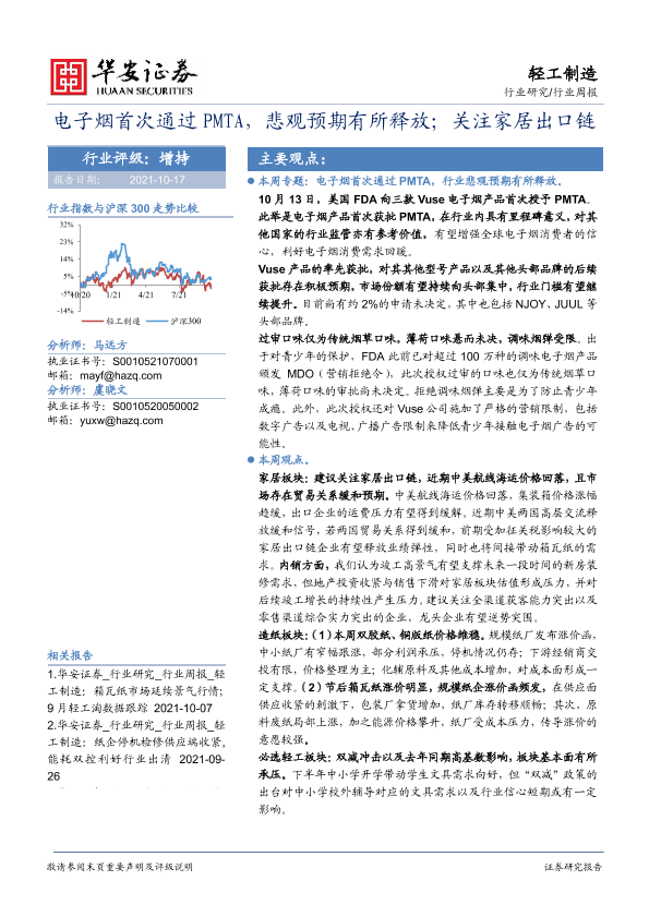 【华安证券】【20211017】20211017-华安证券-轻工制造行业周报:电子烟首次通过PMTA,悲观预期有所释放;关注家居出口链-13页