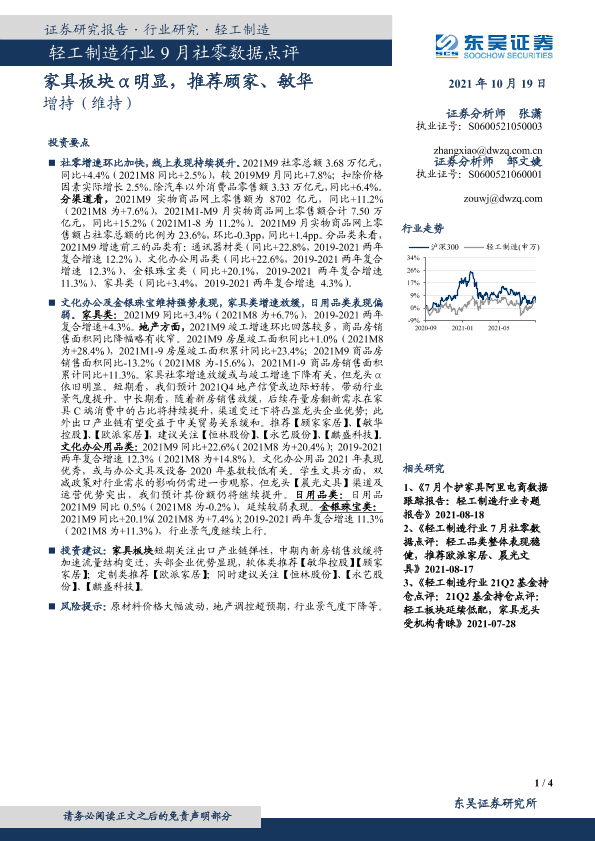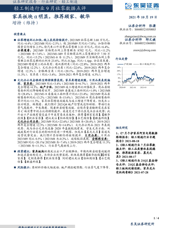 【东吴证券】【20211019】轻工制造行业9月社零数据点评:家具板块α明显,推荐顾家、敏华-4页