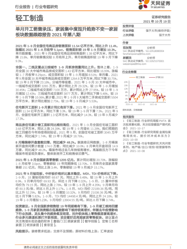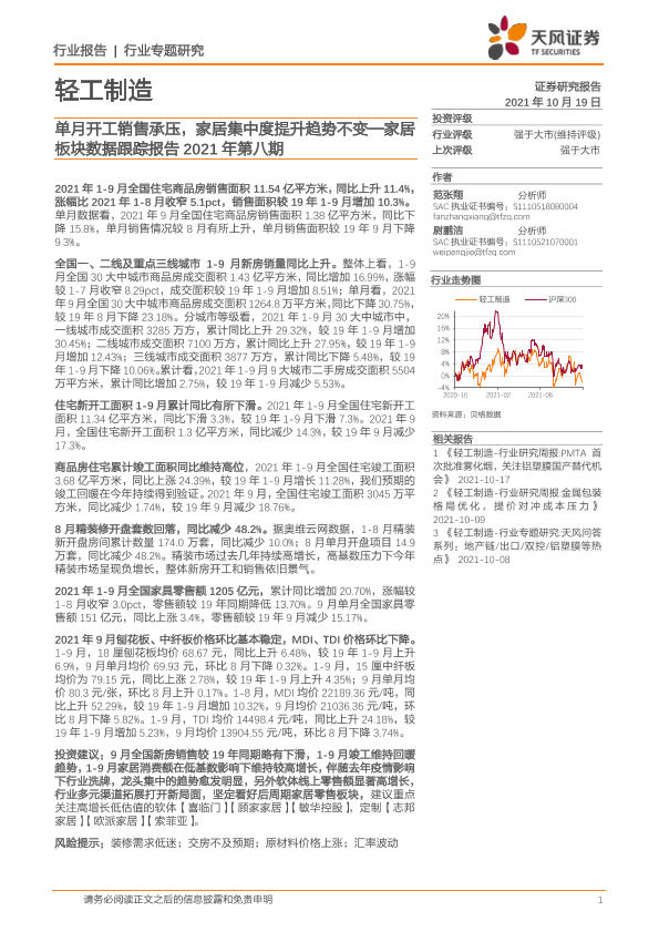 【天风证券】【20211019】轻工制造:家居板块数据跟踪报告2021年第八期:单月开工销售承压,家居集中度提升趋势不变-18页