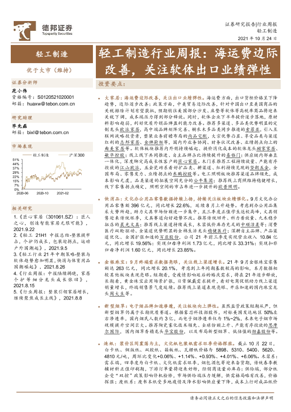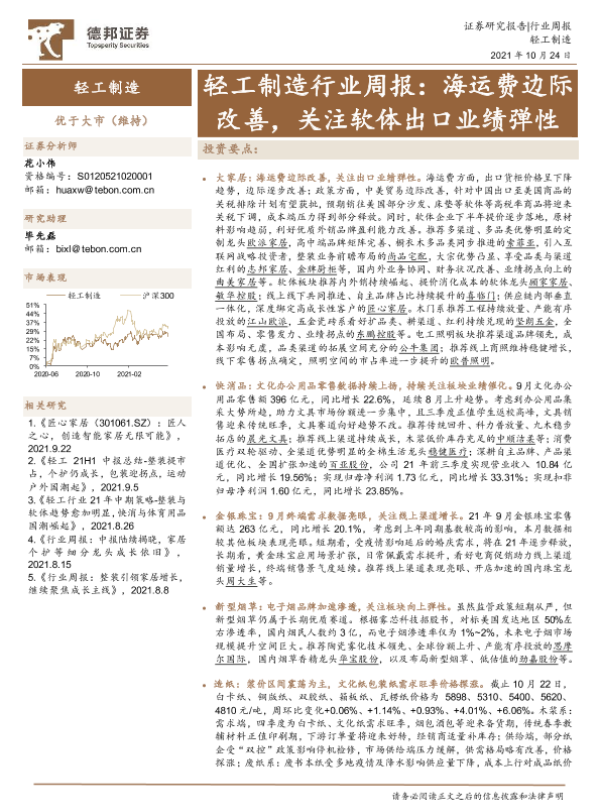 【德邦证券】【20211024】轻工制造行业周报:海运费边际改善,关注软体出口业绩弹性-17页