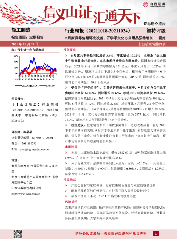 【山西证券】【20211024】20211024-山西证券-轻工制造行业周报:9月家具零售额环比改善,开学季文化办公用品强势增长-14页