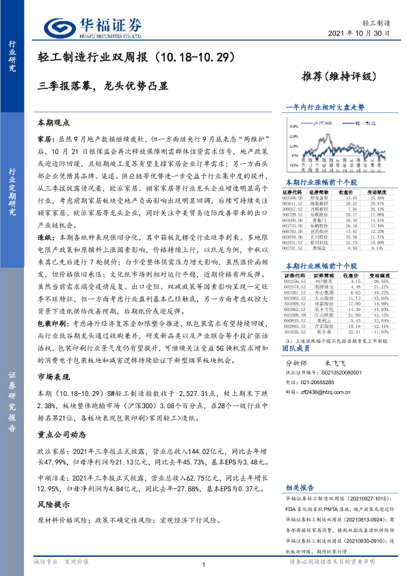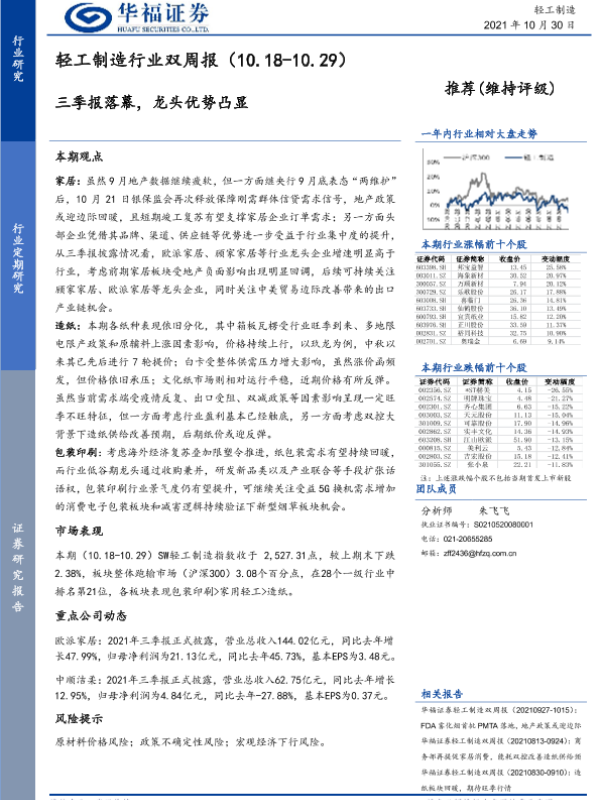 三季报 双周报 行业分析 轻工制造 龙头企业