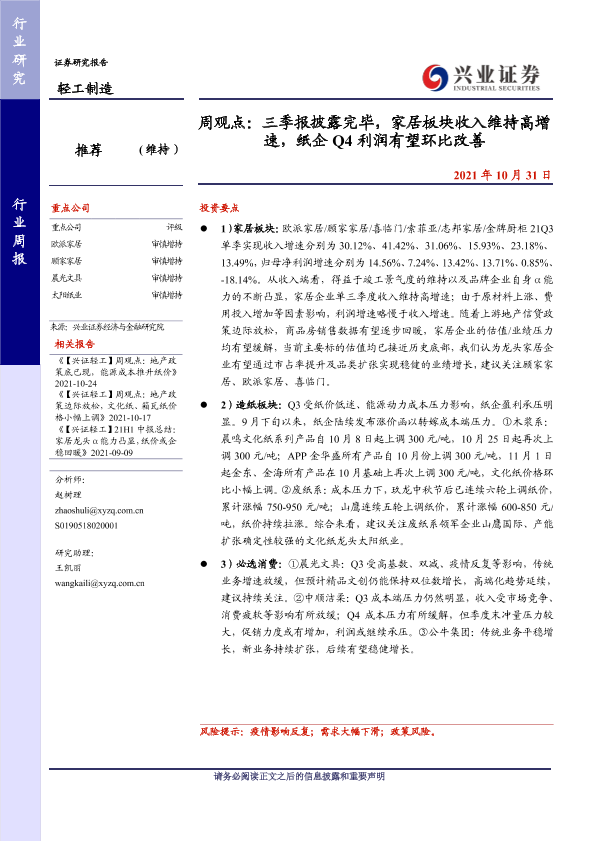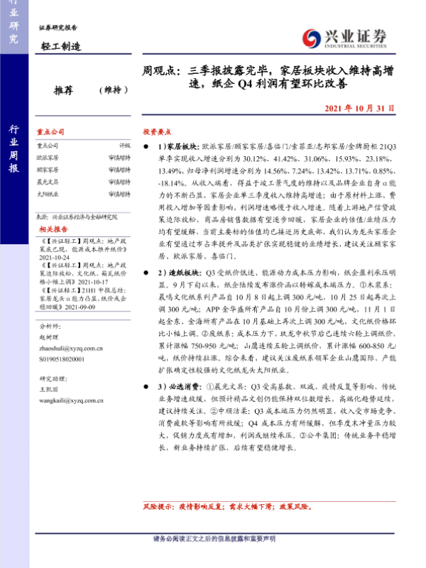 【兴业证券】【20211031】周观点:三季报披露完毕,家居板块收入维持高增速,纸企Q4利润有望环比改善-35页