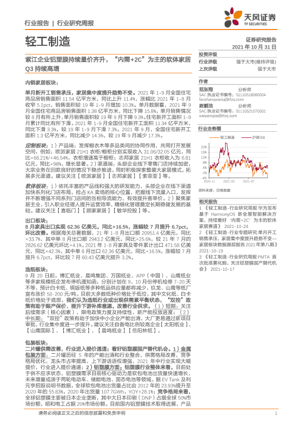 【天风证券】【20211031】20211031-天风证券-轻工制造行业研究周报:紫江企业铝塑膜持续量价齐升,“内需+2C”为主的软体家居Q3持续高增-23页