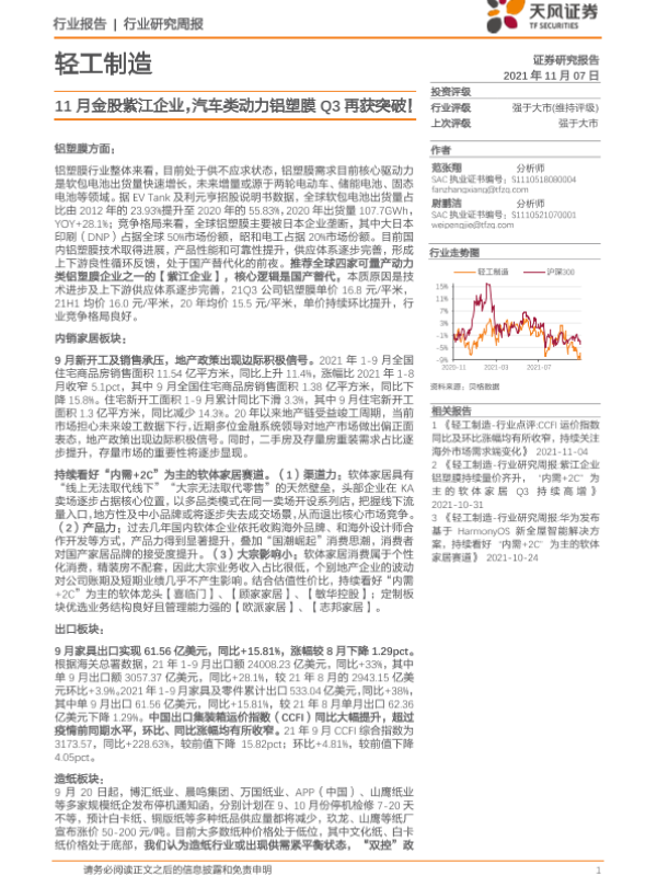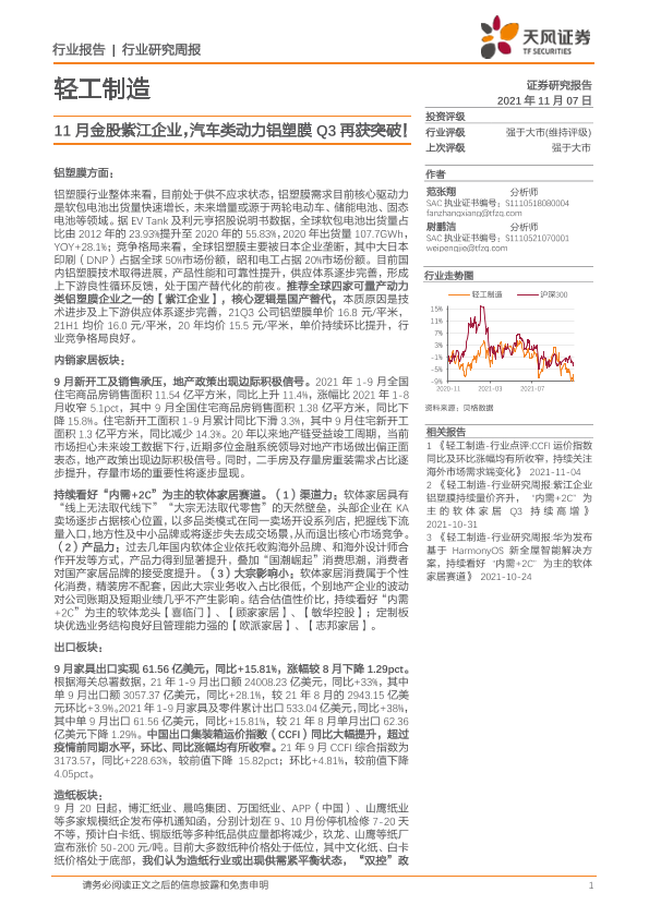 【天风证券】【20211107】20211107-天风证券-轻工制造行业研究周报:11月金股紫江企业,汽车类动力铝塑膜Q3再获突破!-21页