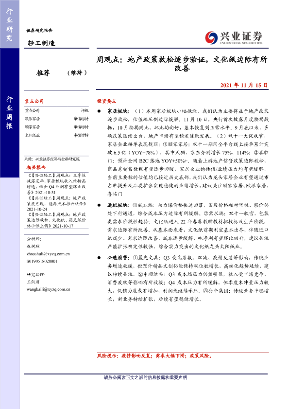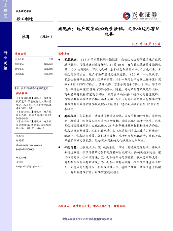 【兴业证券】【20211115】20211115-兴业证券-轻工制造周观点:地产政策放松逐步验证,文化纸边际有所改善-24页