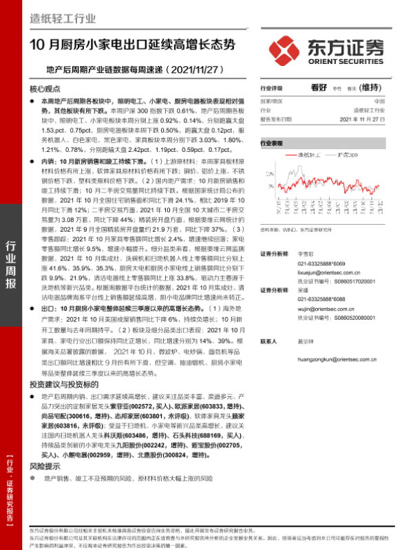 【东方证券】【20211127】20211127-东方证券-造纸轻工行业:地产后周期产业链数据每周速递-10月厨房小家电出口延续高增长态势-14页
