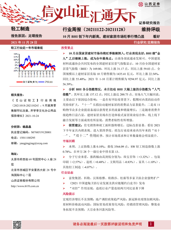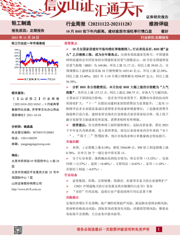 【山西证券】【20211128】20211128-山西证券-轻工制造行业周报:10月BHI创下年内新高,建材家居市场旺季行情凸显-13页