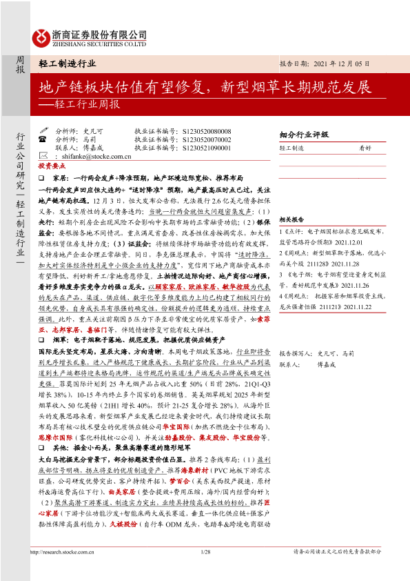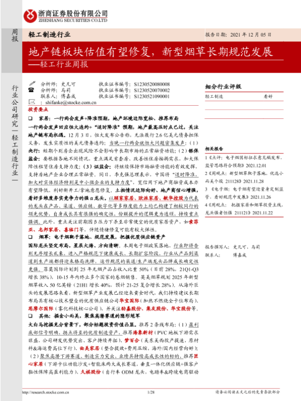 【浙商证券】【20211205】20211205-浙商证券-轻工行业周报:地产链板块估值有望修复,新型烟草长期规范发展-28页