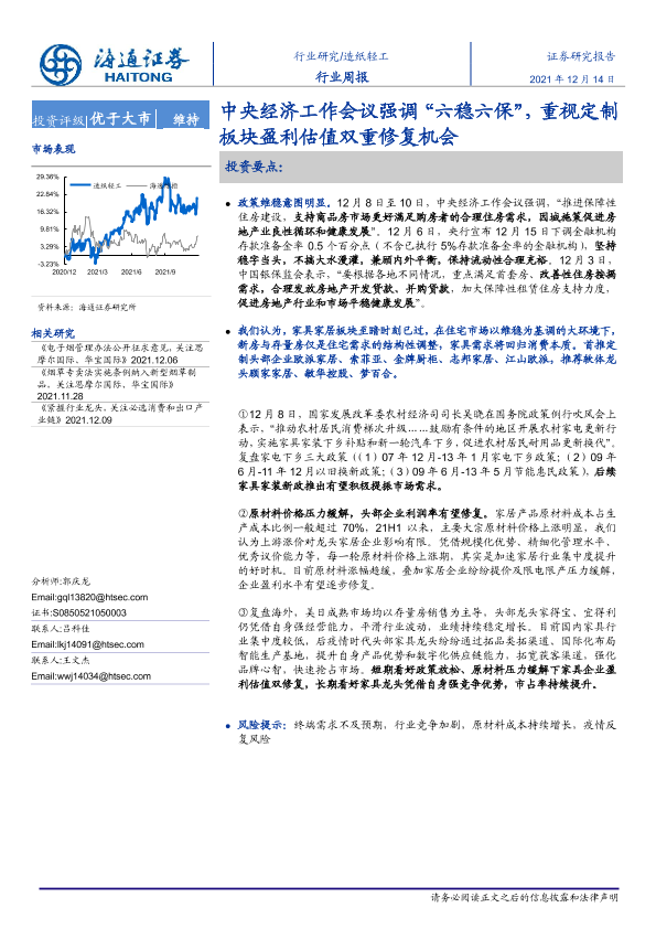 【海通证券】【20211214】20211214-海通证券-造纸轻工行业周报:中央经济工作会议强调“六稳六保”,重视定制板块盈利估值双重修复机会-11页