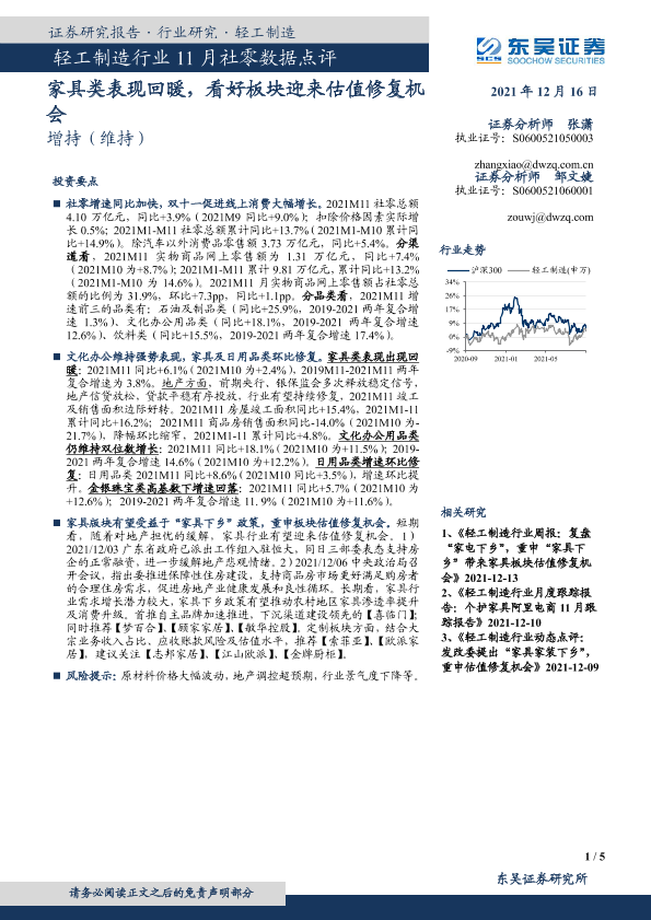 【东吴证券】【20211216】轻工制造行业11月社零数据点评:家具类表现回暖,看好板块迎来估值修复机会-5页