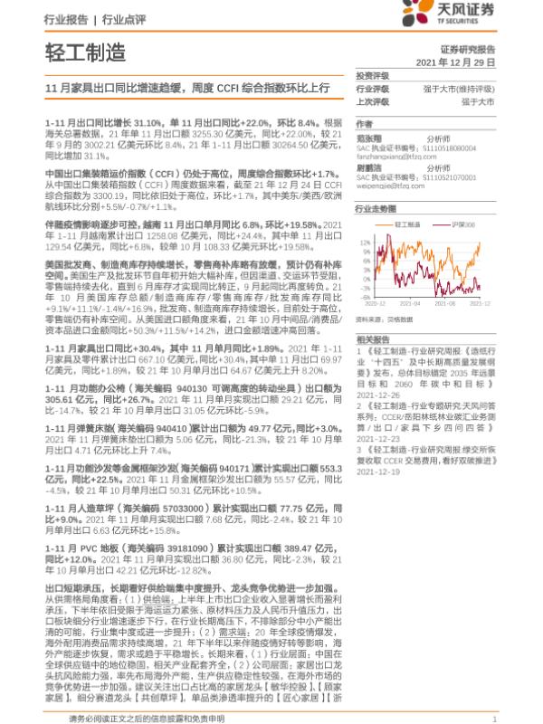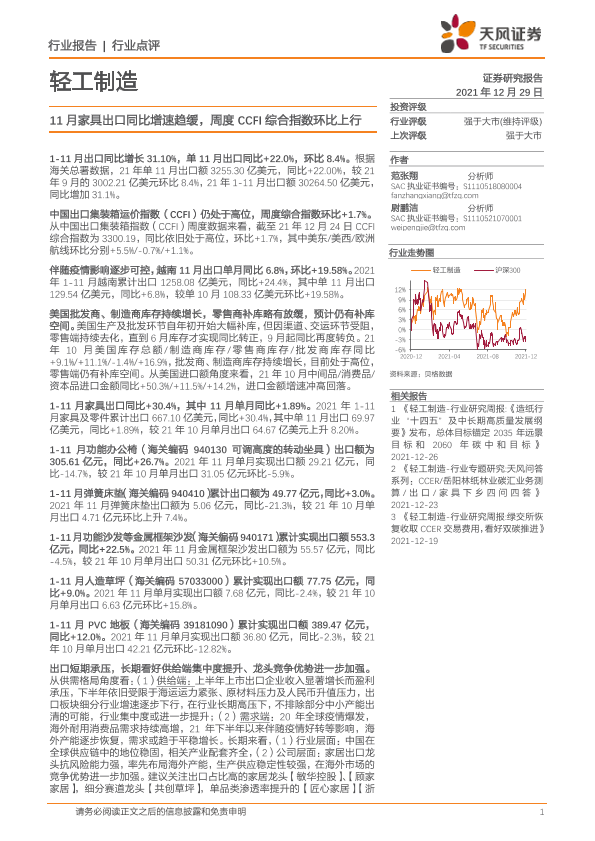 【天风证券】【20211229】轻工制造:11月家具出口同比增速趋缓,周度CCFI综合指数环比上行-7页