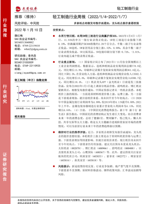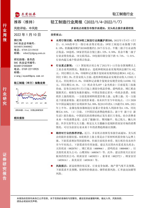 【东莞证券】【20220110】20220110-东莞证券-轻工制造行业周报:多家纸企相继发布涨价函通知,龙头纸企提价意愿较强-10页