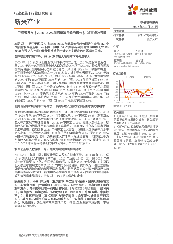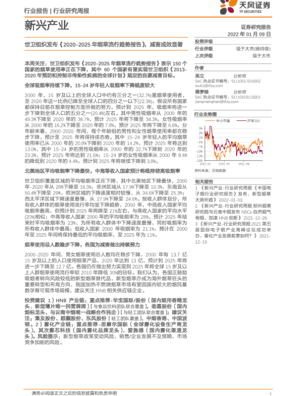【天风证券】【20220109】新兴产业周报:世卫组织发布《2020-2025年烟草流行趋势报告》,减害成效显著-4页